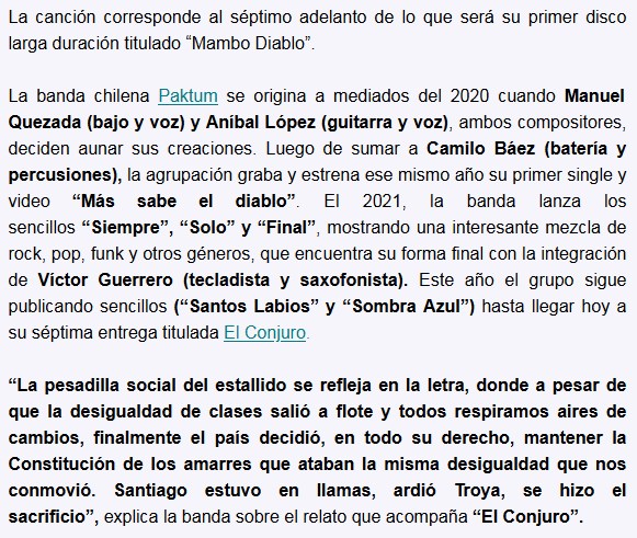Una interesante propuesta nos trae la banda chilena Paktum. Se presentan a través del tema “El conjuro”, que es parte de su álbum debut, Mambo Diablo. Compartimos la información y un video sobre esta canción.