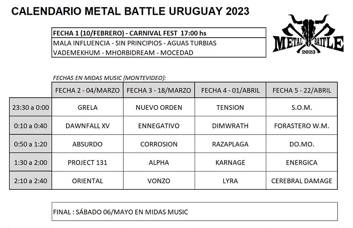 Metal Battle: Batallas en 31 enero, 202331 enero, 2023 A continuación presentamos el calendario de batallas programadas para el Metal Battle Uruguay 2023. Comparte esto:Tweet Haz clic para compartir en Instagram (Se abre en una ventana nueva) Instagram Haz clic para compartir en Reddit (Se abre en una ventana nueva) Reddit Haz clic para compartir en WhatsApp (Se abre en una ventana nueva) WhatsApp Me gusta Cargando...