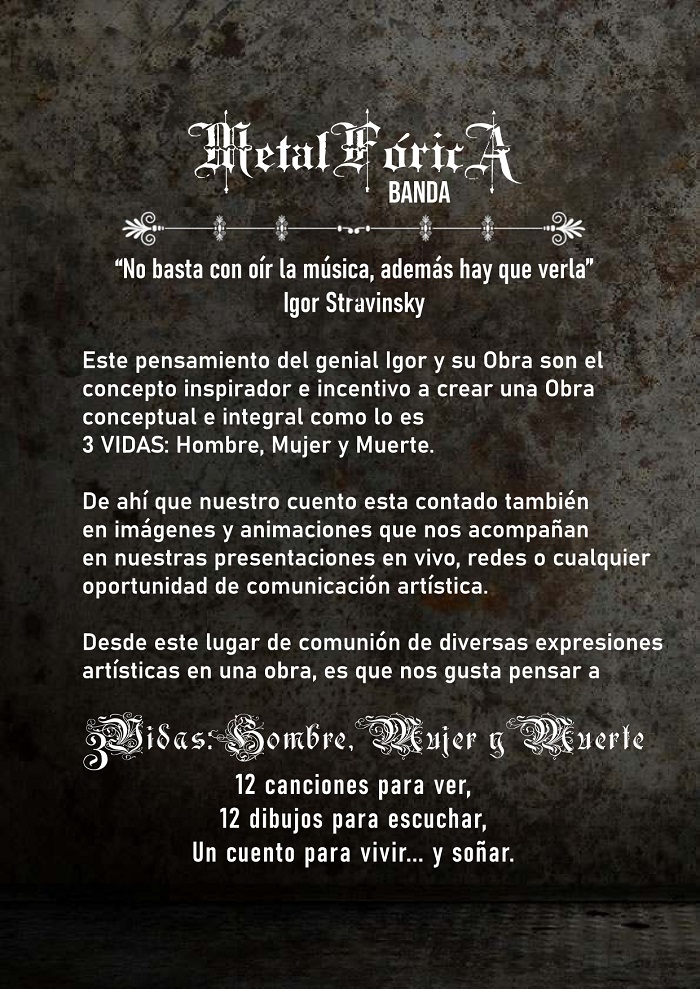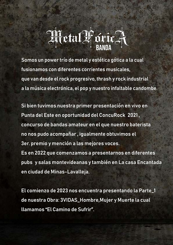 Bienvenidos sean los nuevos sonidos al rock nacional. Metalfórica Banda hace una buena mezcla de ellos en su propuesta, lo que la vuelve más que interesante. Música, letras e imagen que invitamos a que conozcan y disfruten.