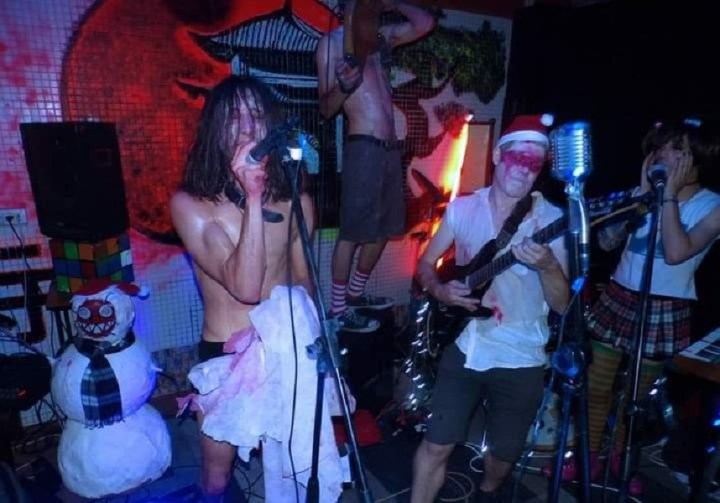 Nacho: Yo hace 22 años que toco y nunca me había pasado una cosa así, que la gente se acerque tanto, más allá de que somos re under, que tenemos cero pretensiones de nada y que nos gusta ir a esos sótanos y gozarnos. Más allá de todo el teatro y el circo, se genera una cosa con el público, hacen catarsis con nosotros. La gente no sabe quién es parte del espectáculo y quién no, nos volvemos todos lo mismo, es muy terrenal de alguna manera. Carlitos Yapor, que es un montajista, nos cambió todo. Hace las luces manuales, y nos armó el arte de los últimos dos toques, con mucho disfrute del proceso.