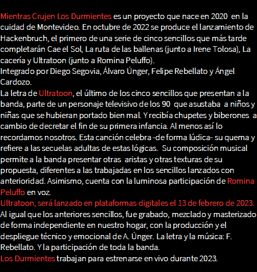 La banda nacional nos hace partícipes del estreno de “Ultratoon”, una animada canción sobre el robot del famoso programa infantil denominado Cacho Bochinche. “Ultratoon” es el quinto simple que Mientras Crujen Los Durmientes lanzan para disfrute de todos sus seguidores. Compartimos la información y la música.