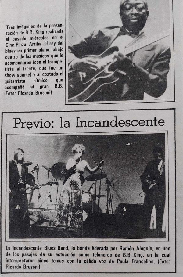 Paula y Ramón: Hemos de admitir que por pura casualidad y la suerte de haber estado en el sitio exacto en el momento exacto. Me explico: una tarde bajaba yo por la calle Paraguay desde 18 hacia Colonia y me encuentro con Miguel Sarli, guitarrista de Metamorfosis, quien me pregunta si me había enterado de que B. B. King tocaría en el Cine Plaza a finales de octubre. Le respondo que no tenía ni idea, y es él quien me sugiere que fuese a ver a Alfonso Carbone (ya que nuestros discos Tres AM y Cómo Cuesta habían sido editados por Orfeo) y le preguntase si no podría La Incandescente Blues Band ser el grupo telonero. Di media vuelta y subí a la oficina de Alfonso, quien me respondió que le parecía una idea sensacional, y que llamase al promotor del evento, Arturo Beyhaut, de parte suya. En 1992 no se disponía de teléfonos celulares, por lo que la llamada la hice desde la cabina que había en la calle. Arturo me dio la dirección de su oficina en ciudad vieja (mi barrio) y me dijo que fuese a verle ipso—facto. Cuando llego a la oficina, me encuentro con Arturo saliendo, y me pide disculpas ya que tenía que llegar al banco antes de que cerrase, y me dice si me importaría hablar en la calle, de camino. Por lo tanto el trato se cerró en la esquina de Cerrito y Misiones, frente a un banco que no nombraré (y que no sé si sigue allí o no). Sólo caben palabras de agradecimiento a los tres, a Miguel, Alfonso y Arturo, sobre todo por la confianza depositada en nosotros.