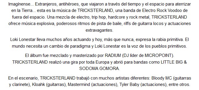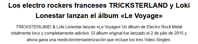 Muy buena e interesante propuesta de los franceses de Tricksterland. Nos presentan a la banda con música y videos que invitamos a que descubran, si no los conocen, y a que disfruten. Nos lo agradecerán.