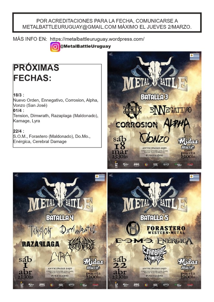 Arranca la primera de las fechas del Metal Battle en Montevideo. La misma tendrá lugar el 4 de marzo en Espacio Midas Music (Rondeau 1493 casi Uruguay) a partir de las 23 horas. Se estarán presentando Grela (Paysandú), Dawnfall XV, Absurdo (Progreso, Canelones), Project 131 y Oriental (Canelones). A continuación compartimos un resumen de la primera etapa celebrada en Paysandú el 10 de febrero en el evento Carnival Fest. Además, brindamos todos los datos de la próxima fecha, incluyendo información de cada una de las bandas que participarán.