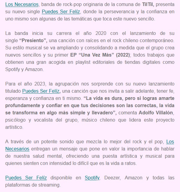 Los Necesarios vienen de Chile y nos presentan “Puedes ser feliz”, su nuevo simple que ya pueden disfrutar escuchándolo a continuación mientras leen toda la información.