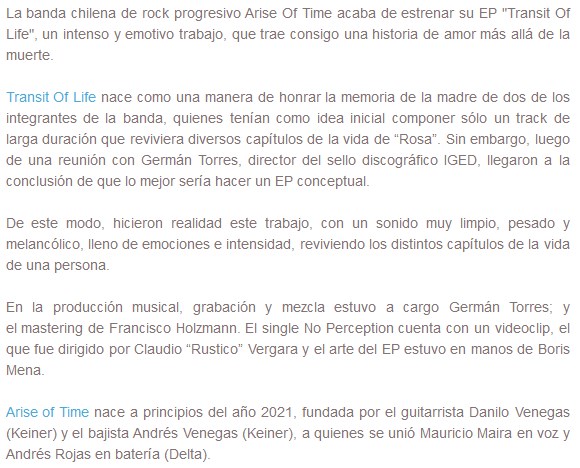 Chile llega nuevamente hasta nuestro país, sonando a través de Arise Of Time. Para la ocasión nos presentan su EP Transit Of Life, del cual la canción “No perception” oficia de simple. También tiene su video, así que podrán escuchar, ver y leer.