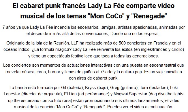 Interesantísima propuesta musical y estética de los franceses de Lady La Fée. Se presentan a través de Sólo Rock Uruguay de la mano de dos videos sobre las canciones “Mon CoCo” y “Renegade”. ¡Esto es rock, gente! Recomendadísimo, no dejen de verlos y escucharlos.