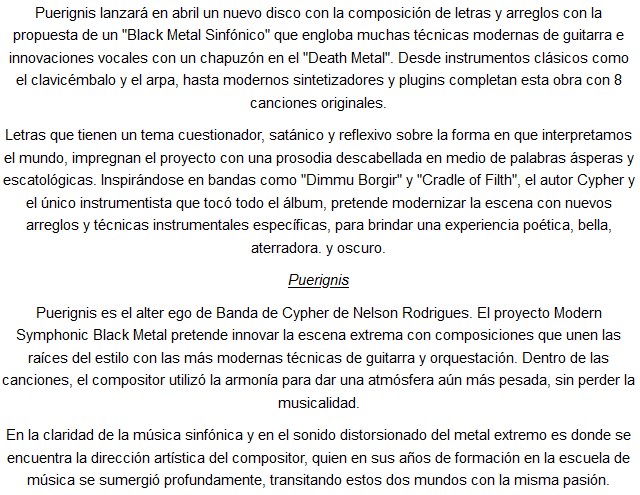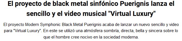 La banda brasileña de metal llamada Puerignis nos trae el lanzamiento del simple “Virtual luxury”. Acompañan la edición con un muy buen video. Se puede apreciar la potencia de la banda, que suena al palo. Compartimos.