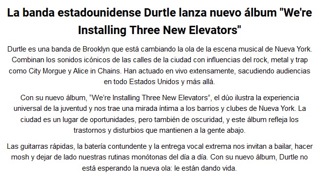 Gran combinación de influencias para lograr que “Under the sun” suene como lo hace. Son los norteamericanos de Durtle los responsables del mágico resultado que pertenece a su álbum We’re Installing Three New Elevators. Para complementar lo sonoro, agregan un video. Pasen a ver, escuchar y leer.