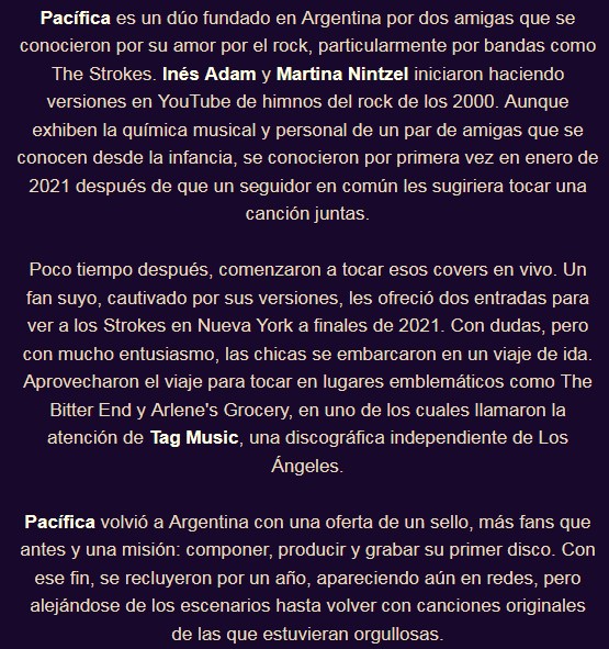 Pacífica es un dúo de Argentina que llega hasta Uruguay para presentarse a través de su excelente canción “With or without you”. De esta manera, el dúo conformado por Inés Adam y Martina Nintzel nos ofrecen su simple debut, que suena fantástico, y que cuenta con un muy buen video.