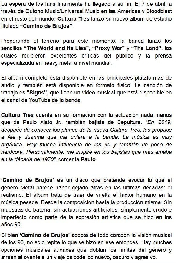 Inquietante introducción para “Signs” para explotar en el minuto 1:10. El tema que es parte del último disco de la banda Cultura Tres, llamado Camino De Brujos, también cuenta con un video. Compartimos.