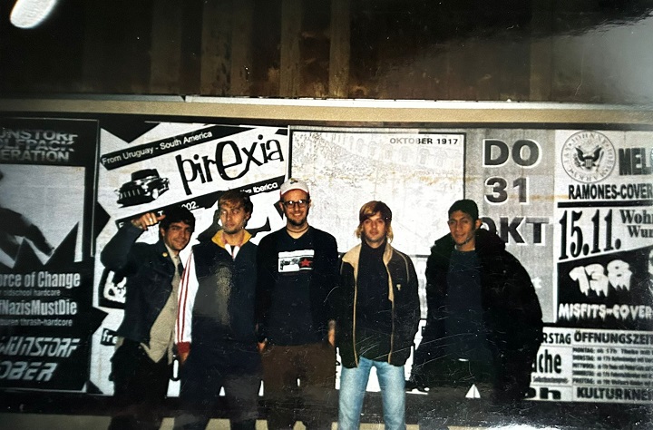Mauro: Fue una banda que trabajó mucho. No sé si fue una banda virtuosa, pero hizo lo que tenía que hacer: se generaron los contactos que había que generar, se fue perseverante y constante con la comunicación y las grabaciones; grabamos todo lo que pudimos en un período de tiempo muy corto y que fue muy productivo. Ensayamos todas las semanas durante muchos años, participamos en los lugares que nos interesaba estar y conectar. Tomamos ejemplos buenos de otras experiencias. Agarramos un mapa y dijimos: “¿Adónde salimos?”. “Bolivia”. “Tenemos un contacto en Bolivia, vamos a escribirle”. “Sí, se puede”. “Bueno, ¿cómo llegamos a Bolivia?”. Llegamos a Bolivia. Había gente que tenía nuestra música, nuestros cassettes estaban copiados. Había pibes que en la casa tenían pintados en la pared mensajes de las canciones. En la calle, un muro impresionante escrito en gigante con una canción en una escuela. Ahí empezamos a delirar, porque todo era en base a mucho sacrificio. Sabíamos que llegábamos, pero teníamos que vender. Habíamos aprendido a hacer nuestro merchandising, remeras, stickers, nuestro fanzine; sabíamos cómo movernos. Chile fue una puerta muy grande que se abrió y vimos que había gente que nos conocía y nos escuchaba y les gustaba de verdad. El medio local siempre fue bastante particular, como diciendo “¿y éstos quiénes son?”. El mensaje nuestro era bastante positivo, no era destroy, todo roto, todo mal, era una estética más positiva. Pero también hicimos lo que había que hacer, mandamos los demos a las radios que había que mandar, participábamos de la movida de Lorena Bello con Agítese Antes de Oír, o Rock And Roll Radio, esos espacios que había que te abrían las puertas y donde la gente iba generando como una movida que te permitía que te mantuvieras. Así fue como un camino en el que también se consolidó con muchos viajes a Argentina, fortaleciendo vínculos y alianzas con bandas que venían mucho a tocar acá. Pirexia quedó como un referente de una escena independiente alternativa de hardcore punk de Uruguay, que hacía que mucha gente de cualquier parte del mundo que se quisiera contactar con alguien de Uruguay, llegara a nosotros. Así fue que conocimos en Buenos Aires, por ejemplo, en un concierto con Eterna Inocencia, a Santi Ric, que era un productor de Zaragoza, España, con un montón de años de experiencia y que había hecho giras en Europa, Estados Unidos y Sudamérica. Él nos propone hacer la gira europea y nos encontramos en ese momento en que teníamos esa oportunidad de ir a Europa por tres meses. Y había que llegar. Hay que ver el contexto, estábamos previo a la crisis de 2002 y somos hijos de trabajadores de clase… que no podría decir media; baja, te diría.
