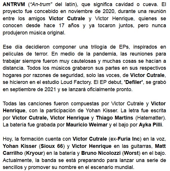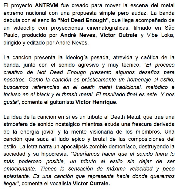 Gran despliegue de sonido metalero. Es una buena definición para lo logrado por Antrvm con su simple “Not dead enough”, el que además cuenta con un video. Compartimos la información y la música a continuación, para que comprueben el sonido de esta banda brasileña.