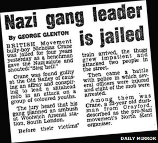 Nicky Crane se ganó su reputación en esos primeros años. A pesar de su ascendente italiano, no tardó en ascender en el escalafón del British Movement y no precisamente por sus dotes de oratoria o capacidad para hacer análisis sociopolíticos. Lideraba un grupúsculo en el sur de Londres y se encargaba de la captación de jóvenes entre los punks, los skinheads y los hooligans. Organizaba ataques que él mismo encabezaba contra los inmigrantes o activistas de izquierda. La fuerte desafección entre la clase obrera, la rabia y las duras condiciones sociales, permitieron que muchos jóvenes de los barrios populares se viesen impresionados por la violencia, el poder y el sentimiento grupal que transmitían individuos como Crane.