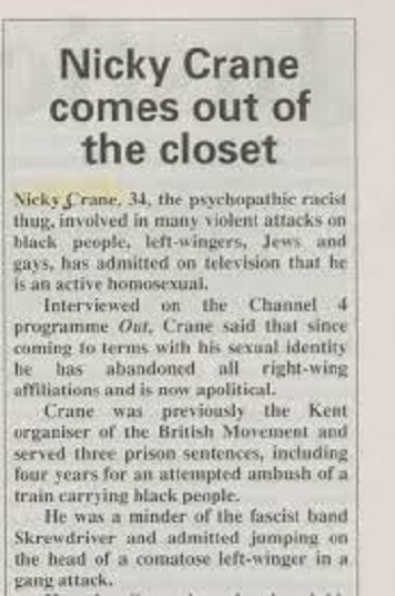 Unos años después, un canal público británico emite una serie de reportajes sobre cómo es la vida de los gays y las lesbianas en Londres. Uno de los capítulos está dedicado a la subcultura gayskin. De forma bastante hábil entrevistan sobre el tema a Ian Stuart de Skrewdriver y al líder del National Front, quienes dicen desconocer la existencia de tal movimiento. A continuación irrumpe en la pantalla Nicky Crane sentado en su cama hablando de su pasado en la ultraderecha y reconociendo que es homosexual. También reniega de sus ideas y suelta un discurso del arrepentimiento, declarando que no se puede juzgar a nadie por el color de su piel.