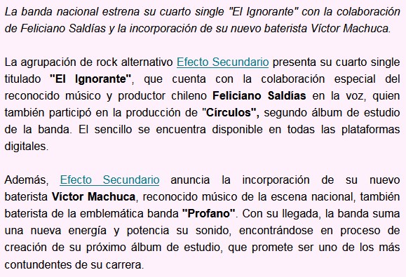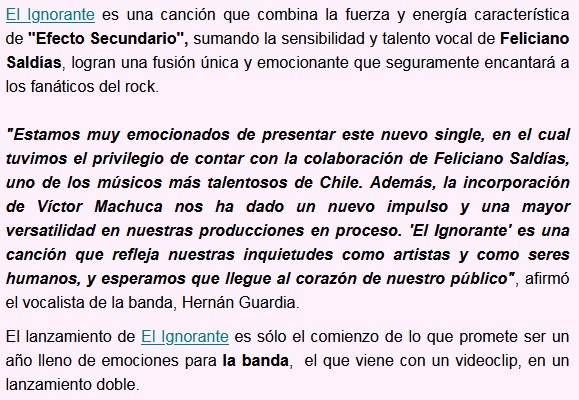 Gran comienzo para un gran tema. Así es “El ignorante”, el simple que la banda chilena Efecto Secundario y para el cual cuentan con la participación de Feliciano Saldías. Una canción 100% rockera que también tiene su video. Pasen a apreciar.