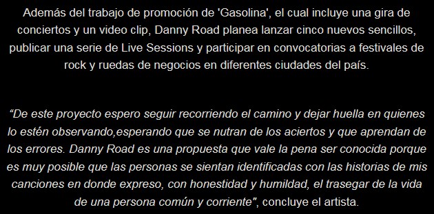 “Gasolina” comienza a sonar y ya nos da la pauta de que es un muy buen tema de rock. El músico colombiano de rock Daniel López presenta así su proyecto solista, que ha denominado Danny Road, con una excelente canción óptimamente interpretada y con ingredientes más que interesantes. Pasen a escuchar y leer.