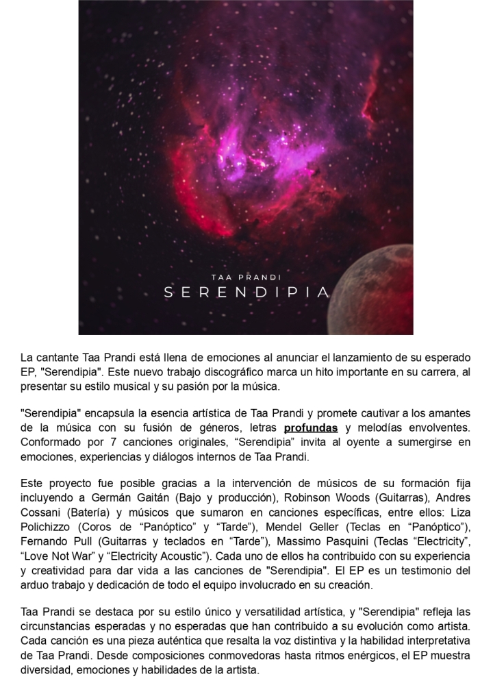 Muy buena propuesta la de Taa Prandi. Proveniente de Argentina, nos comparte su EP llamado Serendipia. Con él presenta un buen lote de canciones con las que logra cautivar y sorprender. Es una invitación a conocer a la artista y su música. Pasen.