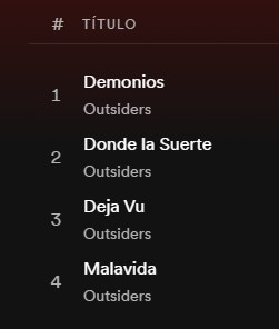 “Demonios”, aparte de ser un rocanrolazo, tiene una profundidad sonora aportada por el bajo, con grandes intervenciones de las guitarras y lucimiento de la bata. Esto es una fórmula que se repite en los trabajos de Outsiders y que se transforma en su sello sin tornarse repetitivo por las diferentes formas que le dan a los temas. Importantes voces y coros son parte de la canción, que invitan a querer gritarlos cuando la banda los toque en vivo. “Donde la suerte” también cuenta con gran trabajo de las voces y los instrumentos para sostener la energía a tope entregando otra muy buena canción. “Deja vu” nos trae un poco de calma sin perder la esencia rockera, apoyada en la infalible receta de la banda. Y para el final nos espera “Malavida”, donde se retoma la línea inicial, yendo nuevamente hasta arriba sumándole interesantes arreglos.