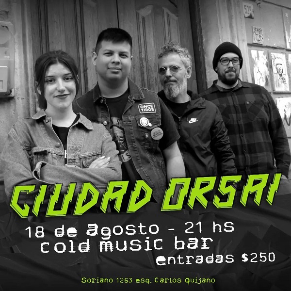 Gabriel: Ciudad Orsai surge en 2017. Ya a finales de 2016 se venía gestando algo con una banda en la que queríamos hacer un tributo a Buitres. Incluso los dos primeros shows de Ciudad Orsai fueron un tributo a Buitres. Había un cantante que se fue y entró Aby, la primera cantante de la banda y ahí vimos la chance de empezar a hacer cosas propias y poder ir por otro lado. Debutamos en febrero de 2017 y en abril ya estábamos haciendo nuestras canciones propias. Incluso el nombre Orsai de la banda iba por una parte de “Buena suerte”, de Buitres, y Ciudad por una canción del Indio Solari, nada que ver.