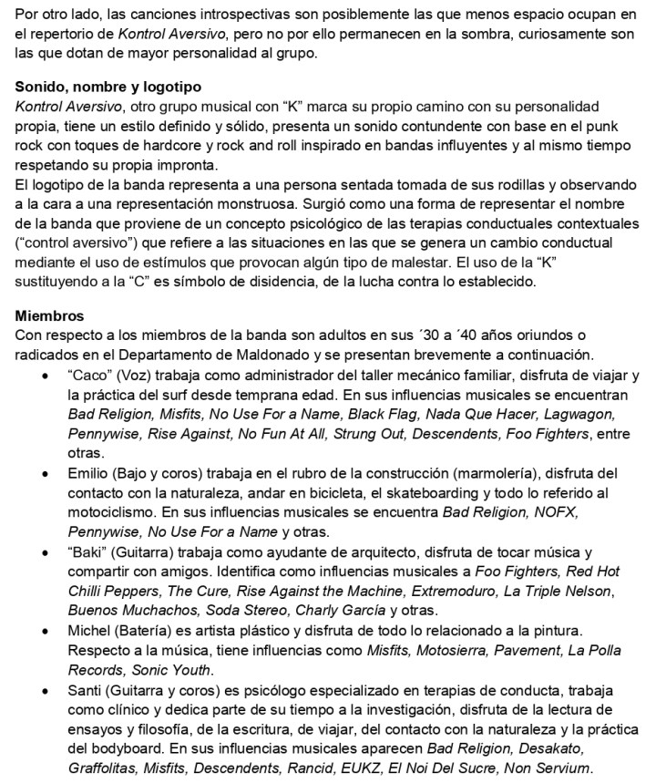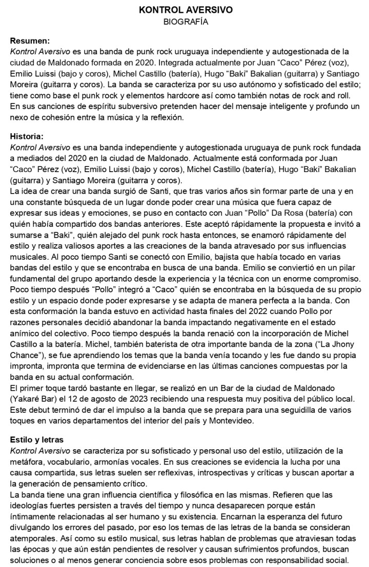 Kontrol Aversivo es una banda de punk rock uruguaya independiente y autogestionada de la ciudad de Maldonado formada en 2020. Integrada actualmente por Juan “Caco” Pérez (voz), Emilio Luissi (bajo y coros), Michel Castillo (batería), Hugo “Baki” Bakalian (guitarra) y Santiago Moreira (guitarra y coros). La banda se caracteriza por su uso autónomo y sofisticado del estilo; tiene como base el punk rock y elementos hardcore así como también notas de rock and roll. En sus canciones de espíritu subversivo pretenden hacer del mensaje inteligente y profundo un nexo de cohesión entre la música y la reflexión.