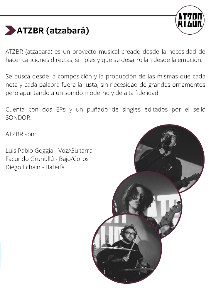ATZBR (Atzabará) es un proyecto musical creado desde la necesidad de hacer canciones directas, simples y que se desarrollan desde la emoción. Sus integrantes son Luis Pablo Goggia (voz, guitarra), Facundo Grunullú (bajo, coros) y Diego Echain (batería).