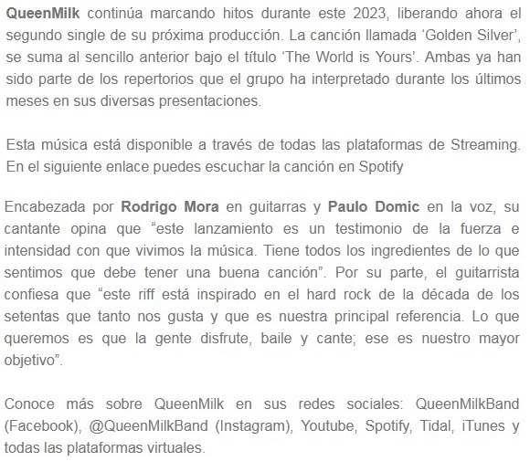 “Golden silver” arranca tremendo y así sigue hasta el final. Dispuesta a volarnos los pelos, la banda QueenMilk nos trae directamente desde Chile este impactante tema como segundo simple de su próximo disco. Por favor, no dejen de escucharlo.