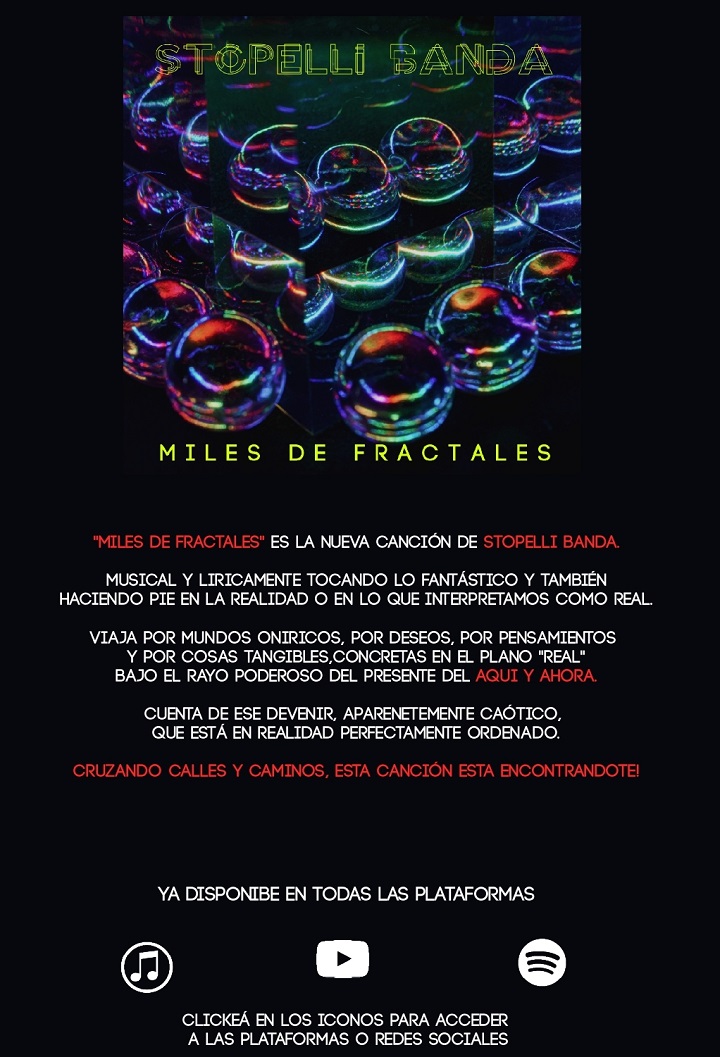 Stopelli Banda Presenta Su Sencillo «Miles De Fractales» en 28 septiembre, 202328 septiembre, 2023 Stopelli Banda Presenta Su Sencillo «Miles De Fractales». Comparte esto:Tweet Compartir en Instagram (Se abre en una ventana nueva) Instagram Compartir en Reddit (Se abre en una ventana nueva) Reddit Compartir en WhatsApp (Se abre en una ventana nueva) WhatsApp Me gusta Cargando...