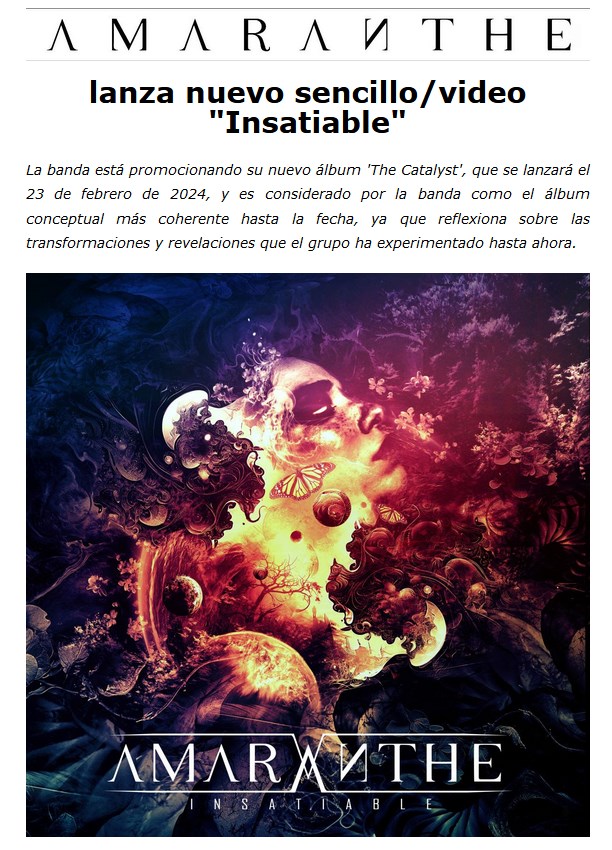 Más rock proveniente de Suecia. Es la banda Amaranthe que nos anuncia la próxima edición de su álbum The Catalyst. Como adelanto, nos presentan el sencillo “Insatiable”, que ya pueden escuchar y ver en el video que lo acompaña.