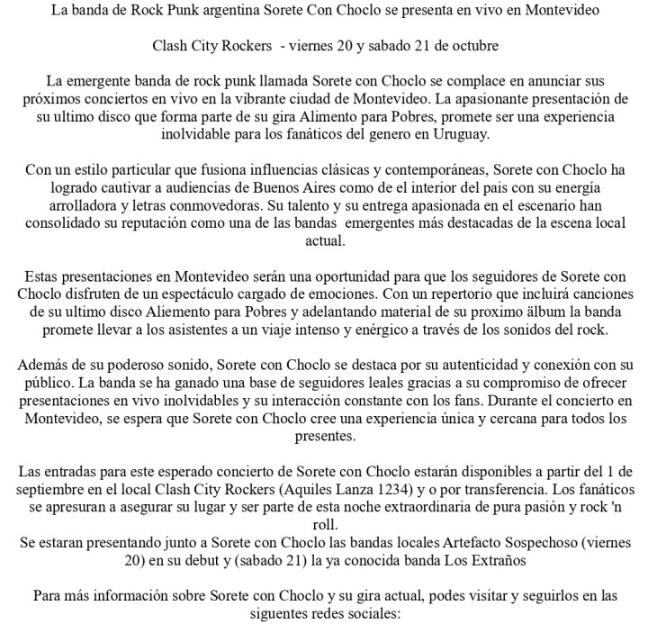 La banda de punk rock argentina, Sorete Con Choclo, se presentará en el Clash City Rockers (Dr. Aquiles R. Lanza 1234) en dos jornadas: 20 y 21 de octubre. Precisamente el día 21 los acompañará la banda nacional Los Extraños. Será puntual a las 21 horas y la entrada está a $200. Ampliamos la información a continuación.
