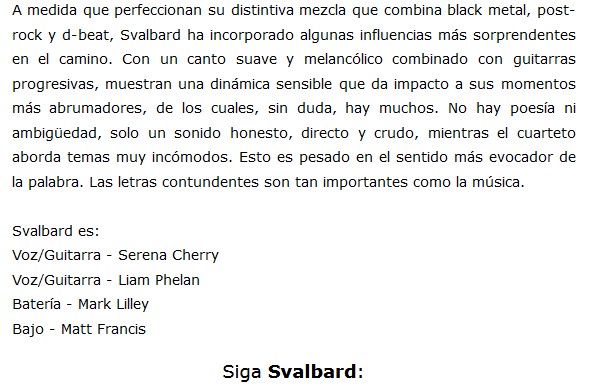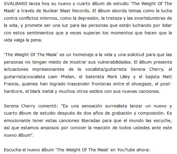 Los ingleses de Svalbard acaban de lanzar su nuevo álbum, llamado The Weight Of The Mask, compuesto por nueve importantes canciones y que suenan de forma arrolladora. Pueden comprobarlo escuchando el disco o viendo algunos videos, a continuación.