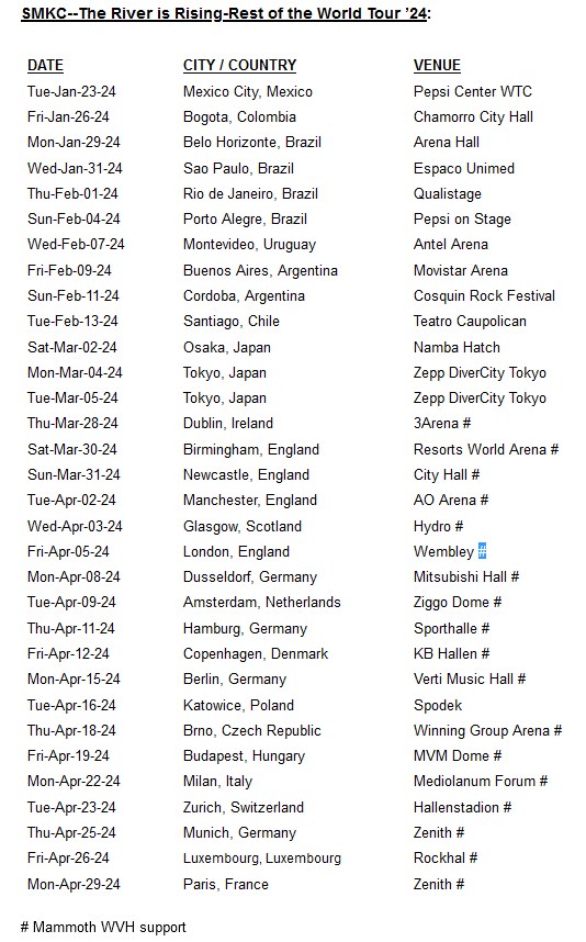 La banda soporte en las diversas fechas de SMKC The River Is Rising-Rest of the World Tour ’24 será Mammoth WVH. Ver las fechas a continuación para una lista completa de los detalles con espectáculos adicionales que se anunciarán en breve.