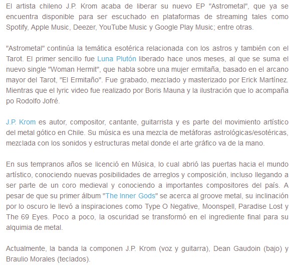 Astrometal. Así se llama el EP que el músico chileno J.P. Krom acaba de lanzar. Seis canciones de metal gótico nos introducen en el mundo de este artista, cuya música sirve de soporte para letras místicas.