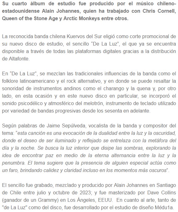 Kuervos Del Sur llegan desde Chile para compartirnos su nueva canción “De la luz”, que es el simple promocional de su próximo disco. Compartimos la música y la información, a continuación.
