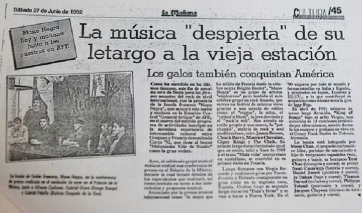 Justamente, Alfonso Carbone fue el responsable de organizar el recital de la Estación de AFE, junto con la Embajada de Francia en Uruguay. Buitres (después de la una) y Kongo Bongo fueron las bandas soporte. Si bien Manu Chao declaró, en aquel entonces, que no había nada que festejar, dado que para muchos pueblos el encuentro entre Europa y América Latina fue terrible, lo cierto es, que al igual que en 1492 con la introducción de la guitarra española, esta vez una batidora de ritmos destrozó la identidad de la rica cultura rioplatense. Sin Mano Negra no hubiera existido La Vela Puerca, La Abuela Coca o No Te Va Gustar. Tampoco Los Fabulosos Cadillacs o Todos tus Muertos, hubieran perdido su original y característico sonido. Un sabio amigo una vez me dijo: “desconfía de aquel que descubrió los Clash después de los 30 años”. Pese a criticar la europeización de Buenos Aires y Montevídeo, ninguno de los integrantes de Mano Negra se quedó a vivir en el medio del Amazonas. Aun así, la interacción entre Uruguay y la troupe francesa propició otras iniciativas creativas menos conocidas pero más interesantes, como la de Moxelis, un grupo teatral montevideano que fundó, a meses de llegar en el Cargo 92, el francés Pascal Wyrobnyk (del cual Renzo Teflón era ferviente admirador).