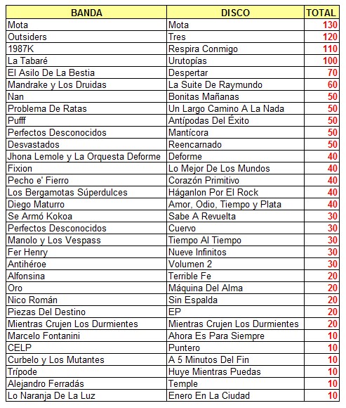 El ranking final de todos los discos mencionados por nuestros invitados a participar en este artículo, arroja los siguientes resultados finales, punteando con 50 a los puestos n° 1 y con 10 menos a los siguientes puestos, sucesivamente.