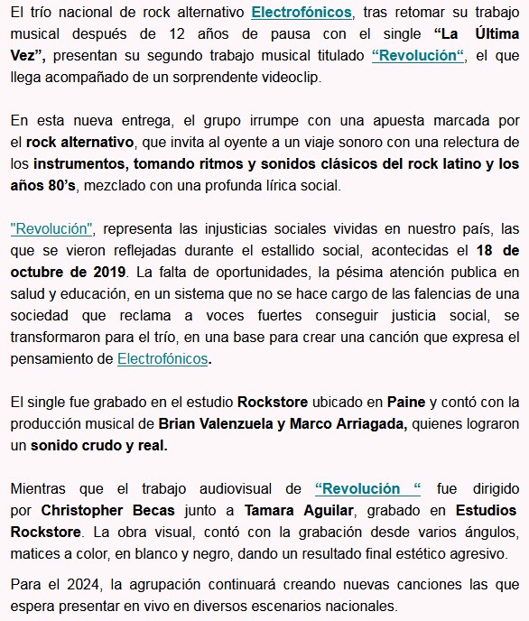 Excelente canción es “Revolución”, de la banda chilena Electrofónicos. En ella mezclan de manera acertada diferentes influencias que erigen al tema en una muy buena experiencia. Para completar el lanzamiento, lo acompañan de un video. Compartimos.