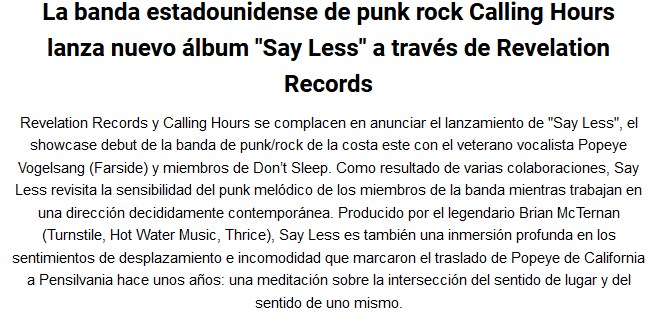 El punk rock viene sonando desde Estados Unidos. Es la banda Calling Hours que nos acerca su último álbum: Say Less. Siete canciones que cumplen con todos los requisitos para transformarse en excelentes exponentes del género. Pueden escuchar el disco y ver un video, a continuación.