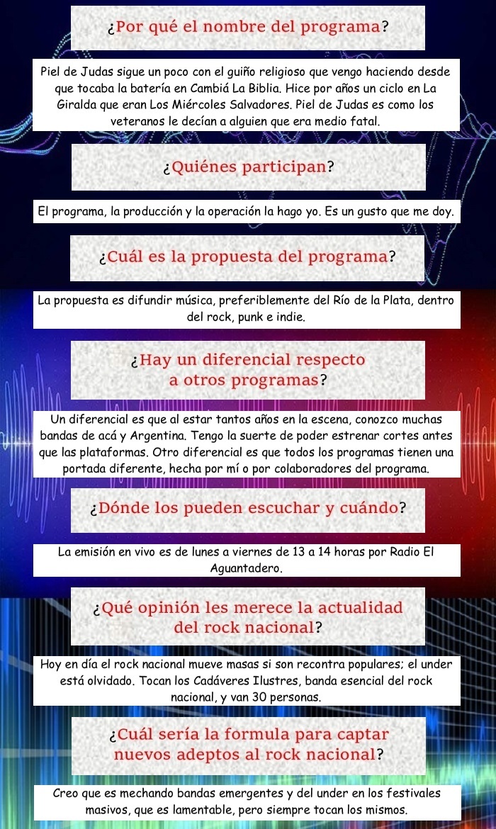 El trabajo de difusión del rock nacional es arduo y se sostiene en esfuerzos individuales o colectivos de gente de dentro del movimiento. Dentro de ese grupo, quienes tienen programas de radio, asumen la grata tarea de pasar música, charlar con músicos y difundir actividades. Con esta serie de artículos denominada Programas Radiales De Apoyo Al Rock Nacional, es nuestro interés sumar la iniciativa de dar a conocer y profundizar el meritorio trabajo de estos colegas. Hoy responde a nuestras preguntas Sapo Ceriani, de Piel De Judas.