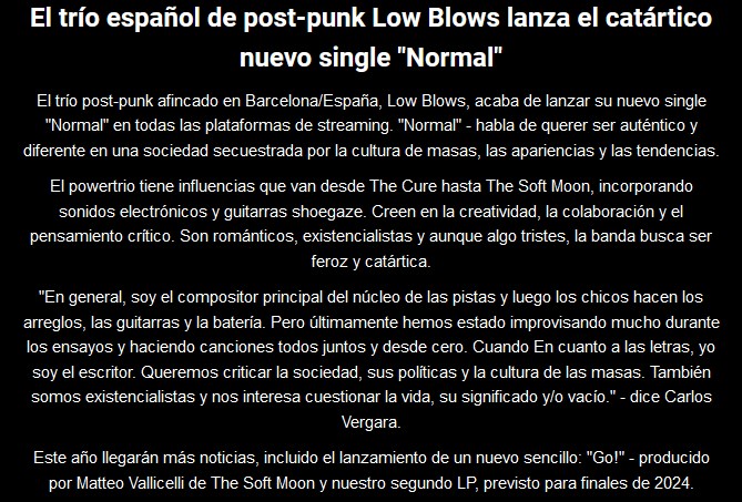 Low Blows es la banda que desde España trae excelentes sonidos hasta las páginas de Sólo Rock Uruguay. Una muestra de ello es su nuevo simple, denominado “Normal”. No dejen pasar la oportunidad de escucharlo y leer la información.