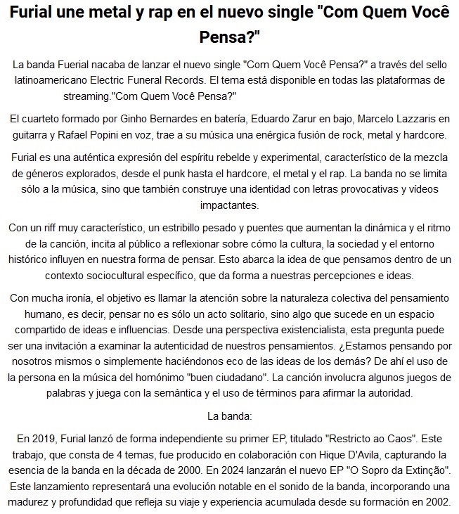 Tremendo tema es Com Quem Você Pensa?, de la banda brasileña Furial. Se lucen mezclando sonidos que van muy bien juntos y que dan resultados como los de esta canción. No dejen de escucharla.