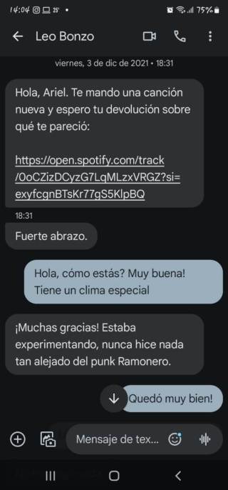 Daniel: Cuando empezamos a juntarnos en esas noches de cerveza y punk rock, la época del MSN, los cyber café, mi correo electrónico era edgardoramone@hotmail.com. A él siempre le causó gracia que mi segundo nombre sea Edgardo, pero desde esa noche para él siempre fui Oscardo. Pasaron los años y siempre me dijo igual. Él no tenía redes ni WhatsApp. Siempre hablamos por mensajes de texto; si no era por ahí era por correo. Esas cosas que hacían al Bonzo el BONZO.