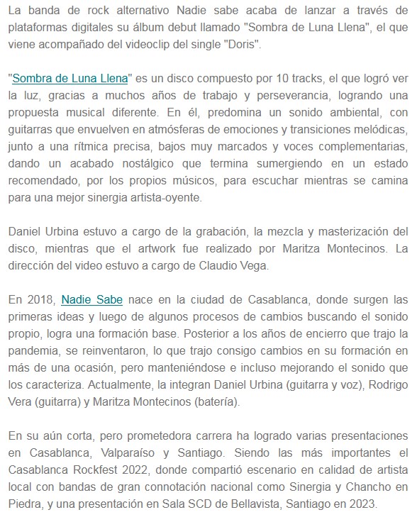 Nadie Sabe es una banda de rock chilena que está lanzando su disco Sombra De Luna Llena. Complementan la edición con un video de su canción “Doris”, el que pueden ver a continuación, junto a toda la información.