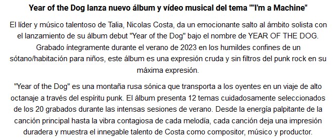 Desde París llega la música de Nicolás Costa en su proyecto solista llamado Year Of The Dog. Presenta su homónimo álbum solista, que trae 12 canciones repletas de energía rockera, que es un gusto escuchar. Compartimos.
