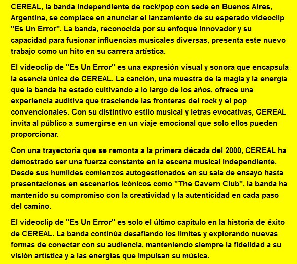 Cereal es una banda Argentina que acaba de lanzar el videoclip de su canción “Es un error”. En él se los puede ver en acción y comprobar el sonido que practican. Los invitamos a verlo, complementándolo con la información que compartimos.