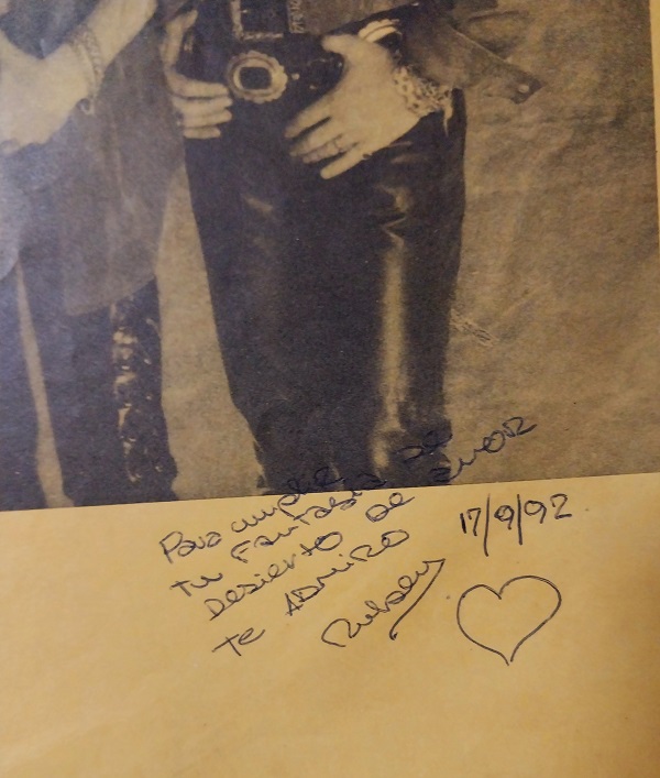 Para mí, el hecho de escuchar un disco, y más si es un nuevo disco, tiene mucha cosa de ritual. Me preparo un mate, pongo el disco en la bandeja, y me siento no sólo a escucharlo, sino también a ver y leer todo el arte, el insert -si lo tiene-, y cualquier info que ese álbum contenga. Estaba en esos menesteres, cuando Jimena se pone a leer el insert, mientras yo oficiaba de cebador designado, y me dice que en el insert del disco había una dedicatoria (!!!): «PARA CUMPLIR TU FANTASÍA DE DESIERTO DE AMOR, TE ADMIRO. RUBEN – 17/9/92 ❤️”