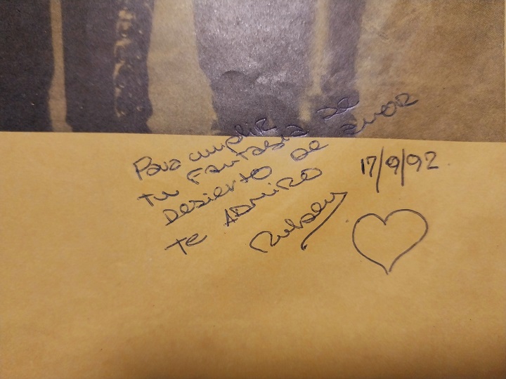 Para mí, el hecho de escuchar un disco, y más si es un nuevo disco, tiene mucha cosa de ritual. Me preparo un mate, pongo el disco en la bandeja, y me siento no sólo a escucharlo, sino también a ver y leer todo el arte, el insert -si lo tiene-, y cualquier info que ese álbum contenga. Estaba en esos menesteres, cuando Jimena se pone a leer el insert, mientras yo oficiaba de cebador designado, y me dice que en el insert del disco había una dedicatoria (!!!): «PARA CUMPLIR TU FANTASÍA DE DESIERTO DE AMOR, TE ADMIRO. RUBEN – 17/9/92 ❤️”