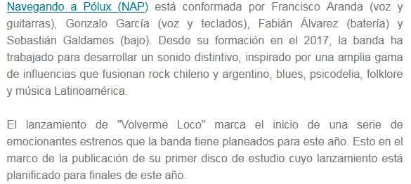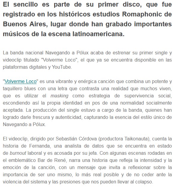 Nuevamente los sonidos de Chile llegan hasta nuestras costas. En esta oportunidad es la banda Navegando a Pólux, que nos acerca su simple “Volverme loco”, al cual deciden complementar con un video. Compartimos.