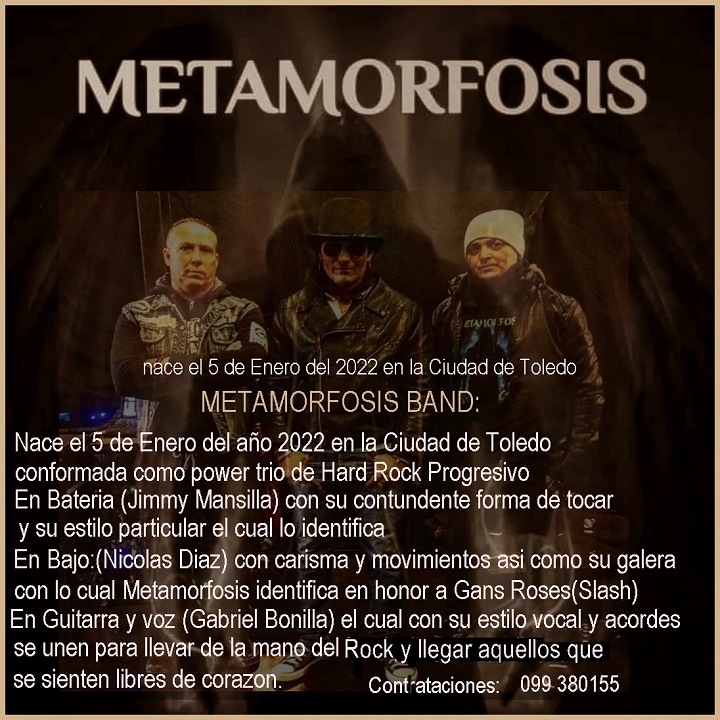 La banda Metamorfosis nace el 5 de enero de 2022 en la ciudad de Toledo. Conformada como power trío de hard rock progresivo, cuenta con Jimmy Mansilla en batería, Andrés Villano en bajo y Gabriel Bonilla en guitarra y voz. Los tres integrantes se unen para llevarse de la mano del rock y llegar a aquellos que se sienten libres de corazón.