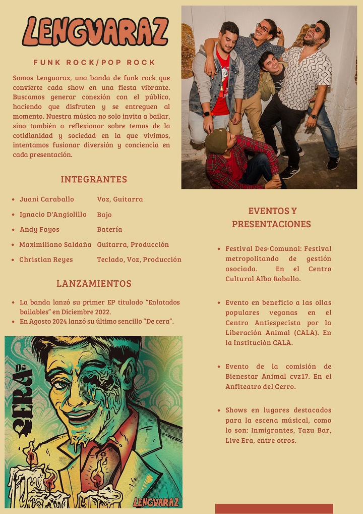 Lenguaraz es una banda de rock nacional que basa su propuesta en el funk rock. Su intención es fusionar diversión y conciencia en cada presentación que realizan. Actualmente está integrada por Juani Caraballo (voz, guitarra), Ignacio D’Angiolillo (bajo), Andy Fayos (batería), Maximiliano Saldaña (guitarra, producción) y Christian Reyes (teclado, voz, producción). A continuación compartimos toda la información.